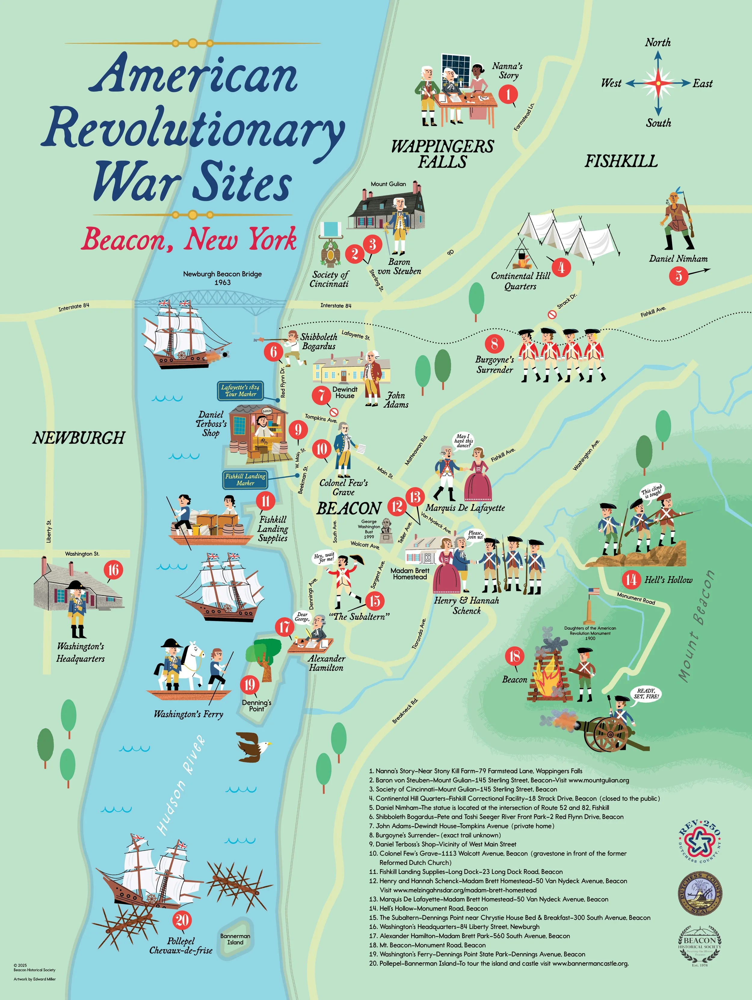 Get ready to celebrate America's 250th birthday! Our new map explores 20 places - and tells 20 stories - that illustrate the role that Beacon and its adjacent areas played in America’s beginning. Visit us at the Beacon Historical Society (61 Leonard Street, Thursdays 10-noon and Saturdays 1-3 p.m.) to receive your free copy and learn more about Beacon’s role in the American Revolution. This project was paid for in part by Dutchess County.