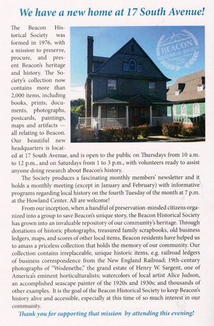 By now, you know where this story is going ... Things have changed for the better, and as I stand here this eventful evening, I can imagine all of my late friends and colleagues--those founders who built this Society and since have passed on--figuratively standing alongside me and cheering us on. For their long-held dream--that of a permanent home for Beacon Historical--finally has become a reality.